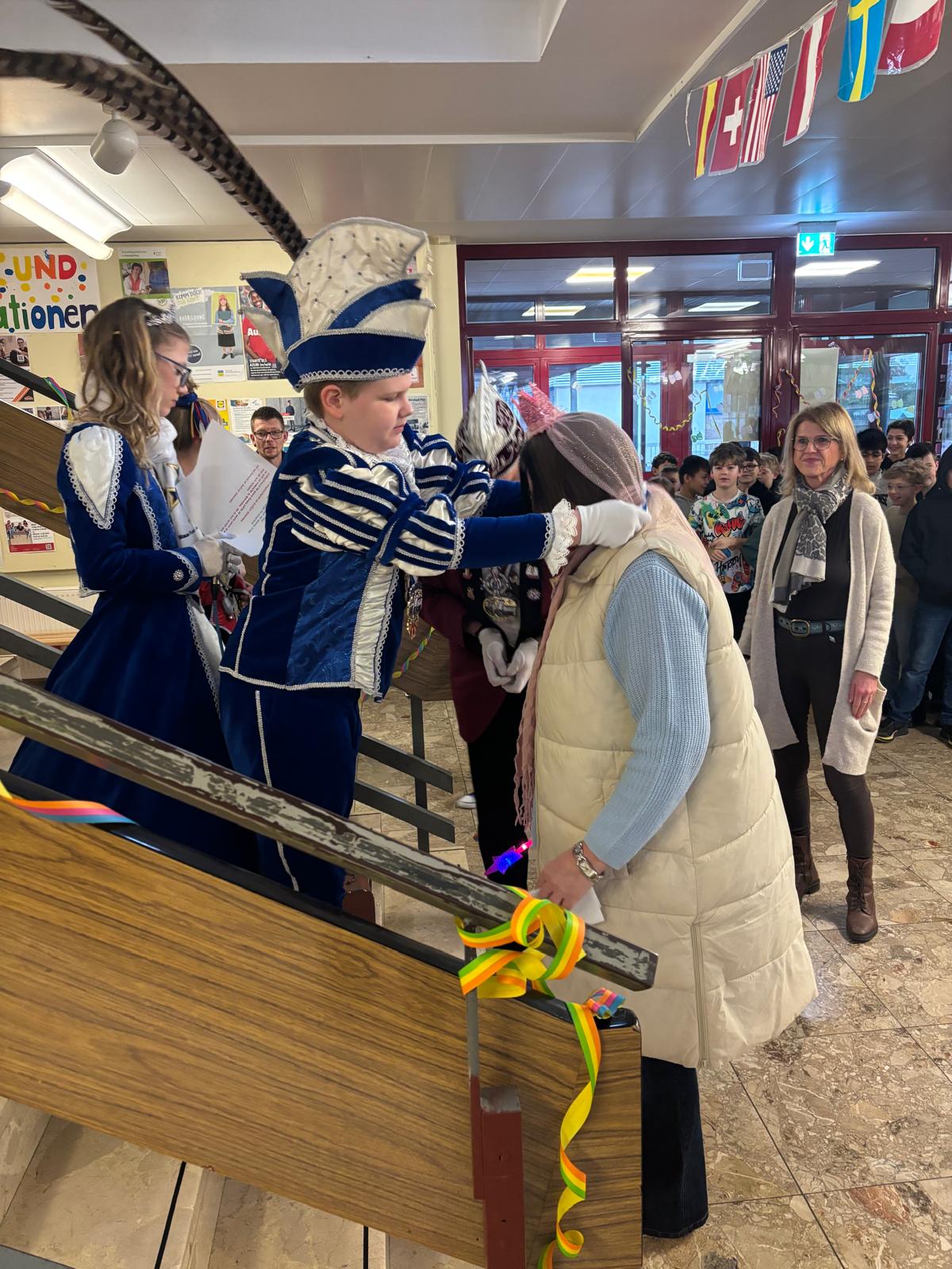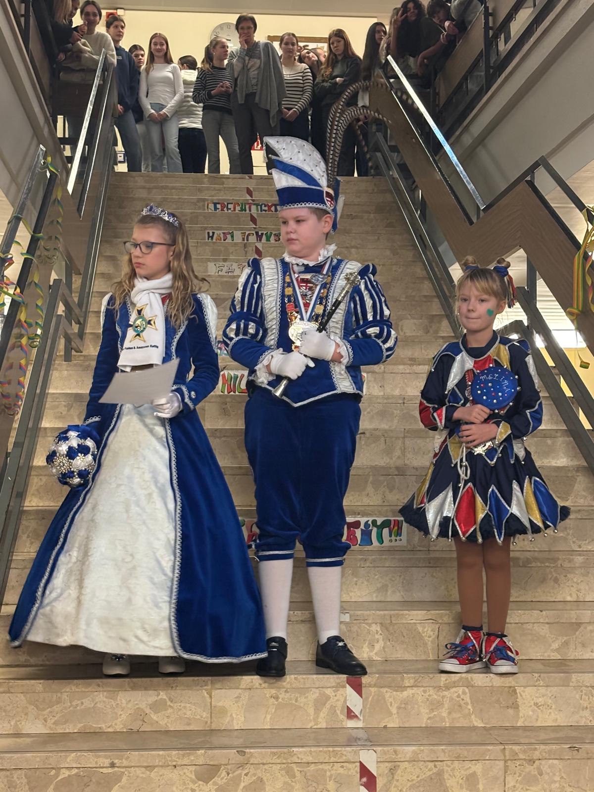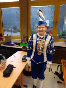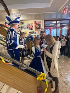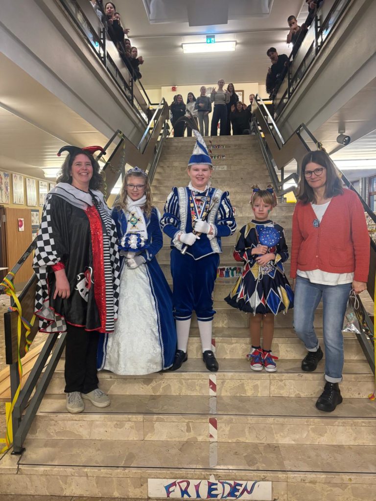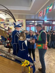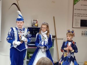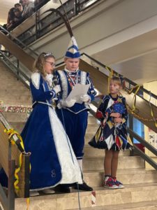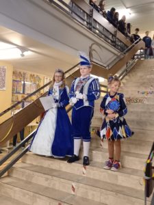 Nach dem närrischen Empfang durch die Schulgemeinschaft mit Karnevalsmusik und kurzweiligen Ansprachen besuchten die beiden mit Mitgliedern ihres Hofstaats auch noch ihre Klassen, bevor es für sie weiter ging zur nächsten Veranstaltung.