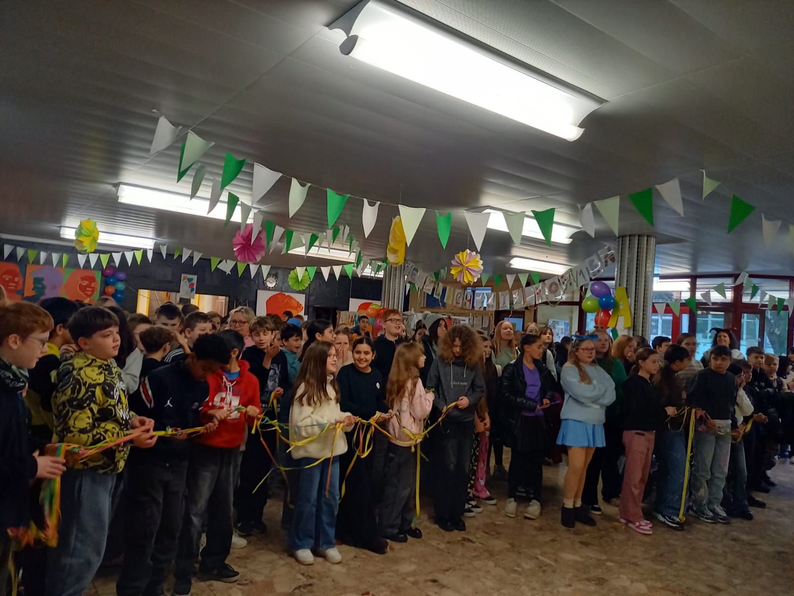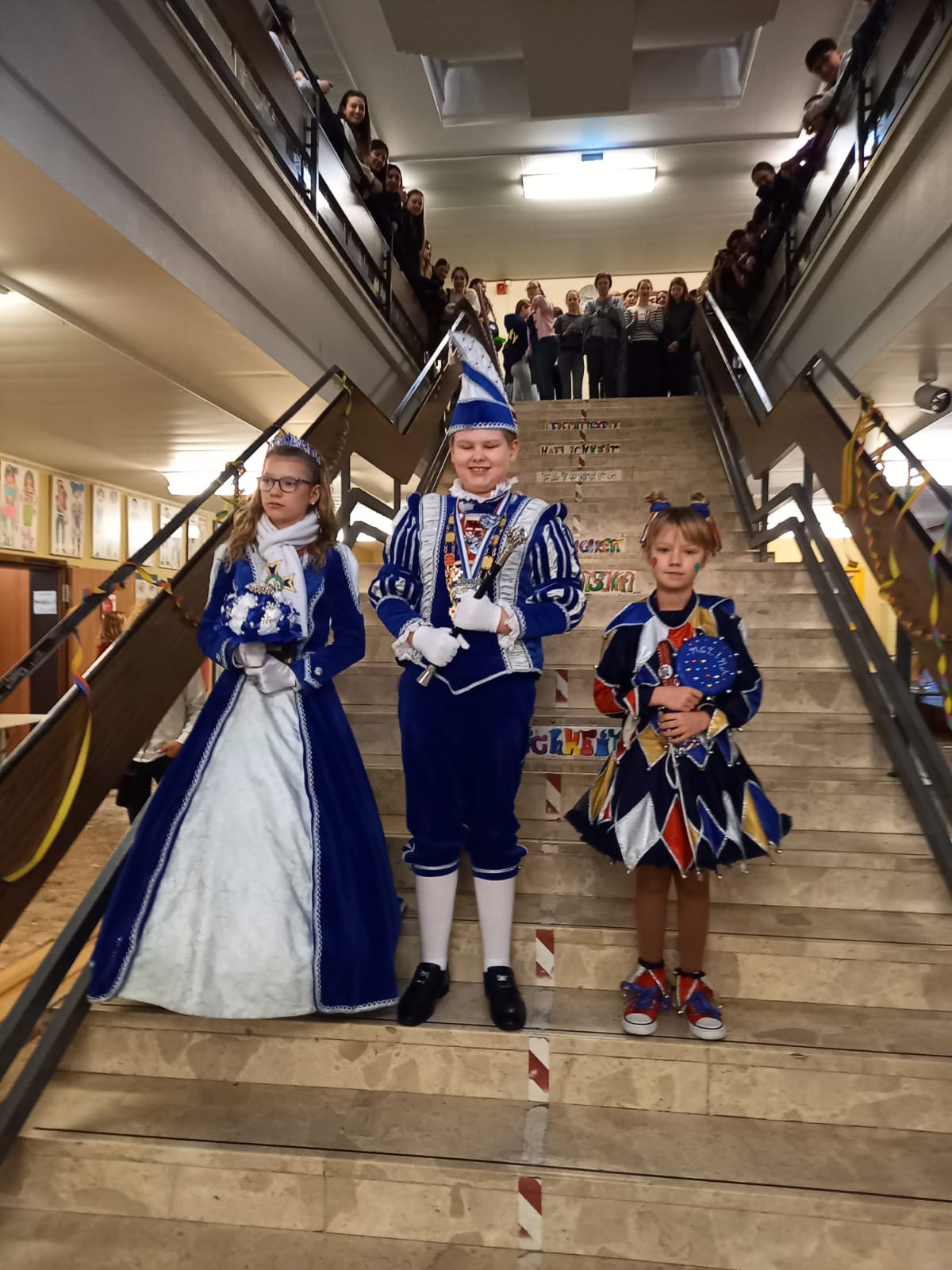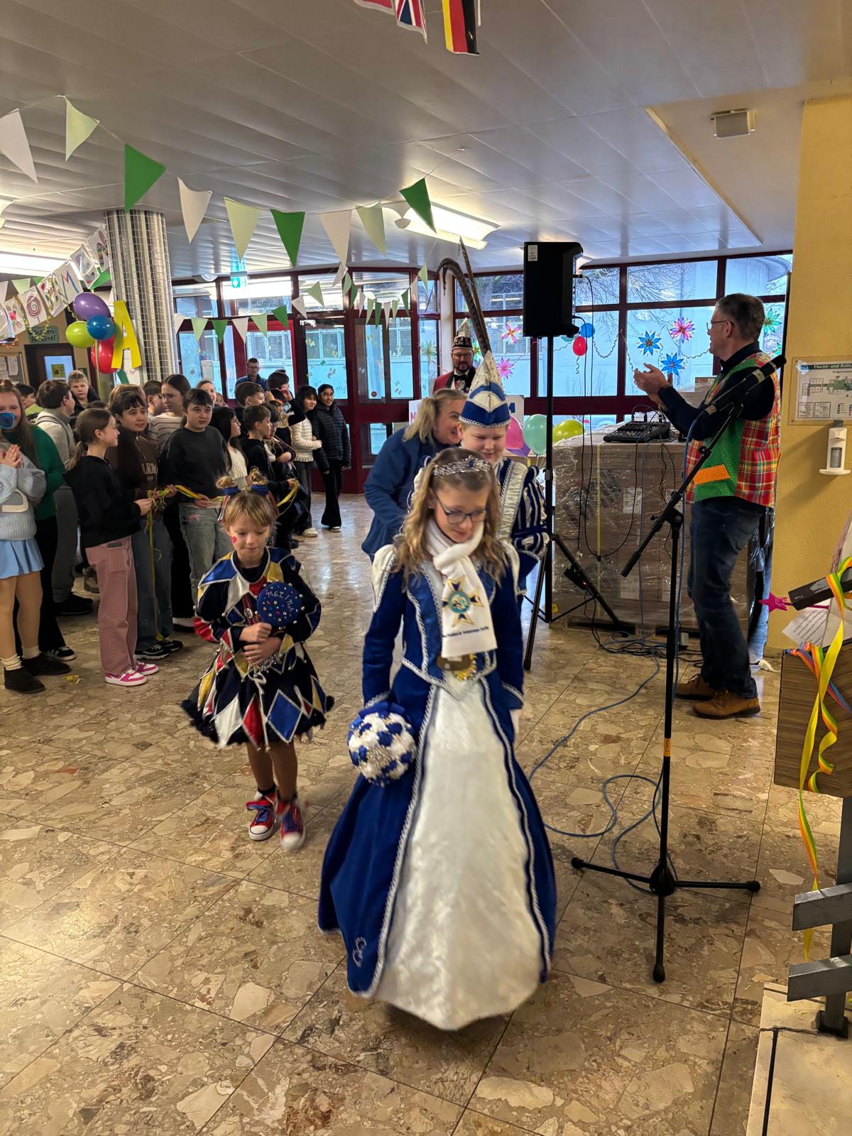 Nach dem närrischen Empfang durch die Schulgemeinschaft mit Karnevalsmusik und kurzweiligen Ansprachen besuchten die beiden mit Mitgliedern ihres Hofstaats auch noch ihre Klassen, bevor es für sie weiter ging zur nächsten Veranstaltung.