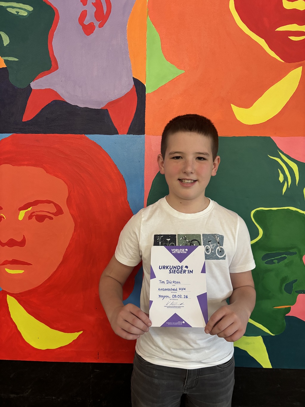 Ein großer Erfolg für unsere Schule: Tim Dürksen aus der Klasse 6c hat beim Kreisentscheid des Vorlesewettbewerbs den 1. Platz erreicht. Zunächst präsentierte er souverän einen Ausschnitt aus dem Buch Børre und die Rentiermafia und überzeugte die Jury mit seiner sicheren und lebendigen Vortragsweise. Nach der Vorentscheidung zog er ins Finale ein, wo er auch bei einem unbekannten Text sein Können eindrucksvoll unter Beweis stellte.